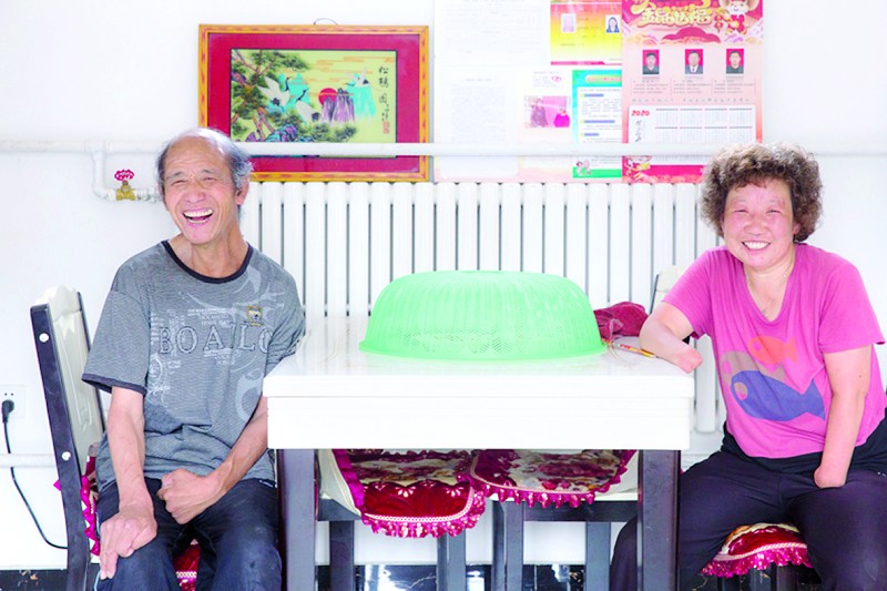 20歲那年,趙玉蘭嫁到了湯子嶺村。患有小兒麻痹癥的張波自此成了她一生的伴侶。但由于張波常年臥床,無法正常行走和說話,生活基本不能自理。30多年來,都是趙玉蘭和張波相濡以沫,共歷風雨。“最難的就是扶他(張波)去廁所,晚上睡覺也不踏實,怕他掉下來。”回憶起30多年來的點點滴滴,趙玉蘭感觸頗多。既要做農(nóng)活養(yǎng)家,又要照顧兩個兒子。好在婆婆能幫上忙,30多年就這么堅持了下來:菜刀在趙玉蘭的“手”中上下飛舞,轉(zhuǎn)眼間一個西紅柿就被切成了小塊;細細的棉線也只用了不到一分鐘,便紉到了兩“手”間的鋼針里。