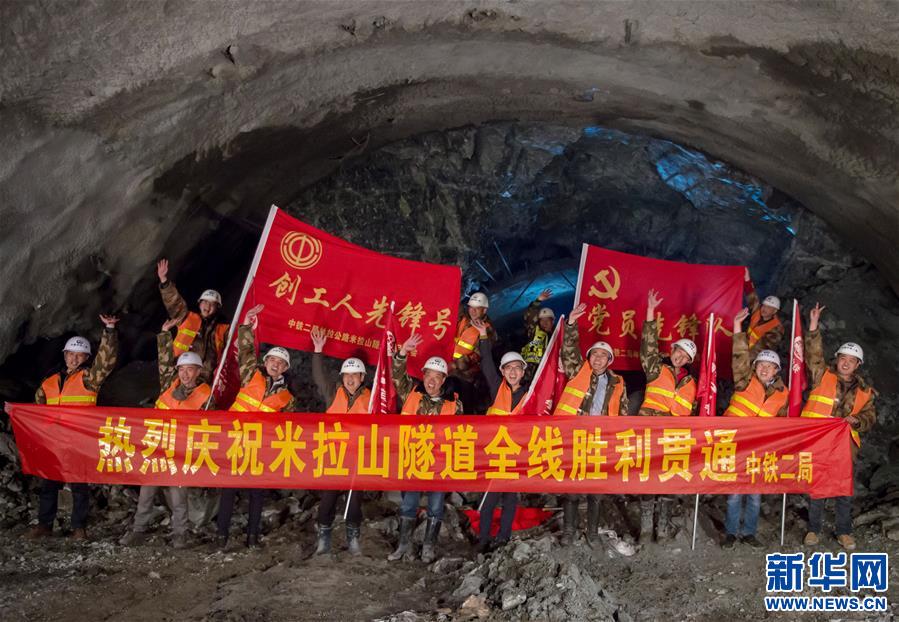 7月30日,拉林高等級公路米拉山隧道建設者在慶祝隧道貫通。新華社發(旦增尼瑪曲珠 攝)