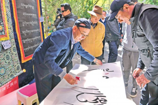 國慶期間,拉薩市宗角祿康公園、羅布林卡公園、南山公園、曲米路濕地公園舉行了文藝演出、特色產品展銷、書法展示、藏戲表演等一系列活動。圖為拉薩市書法家和書法愛好者在羅布林卡內為過往市民獻上書法作品。記者唐斌 次旺 攝