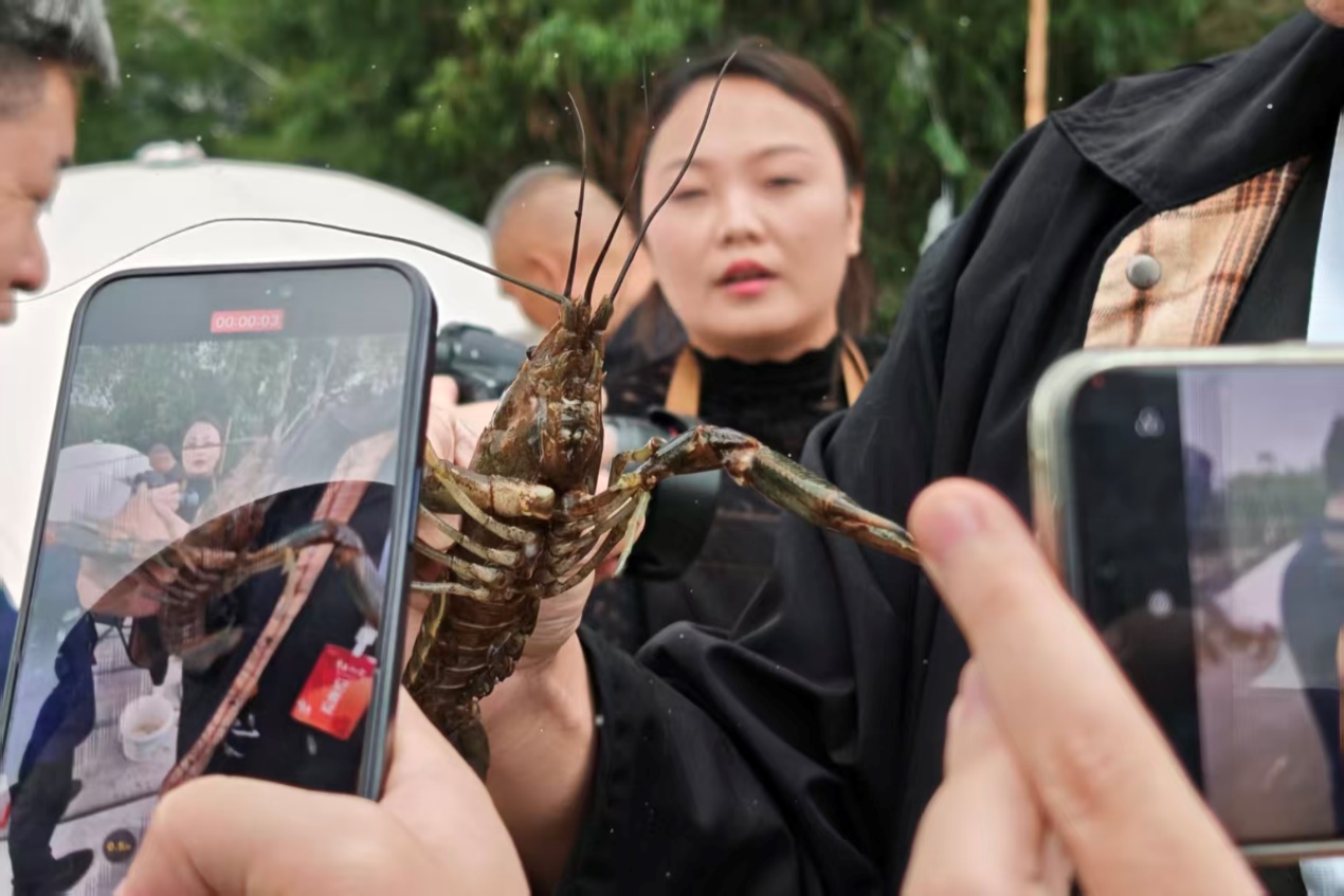 游客在田間釣起澳洲淡水藍龍蝦(央廣網發 鄒巧 攝)