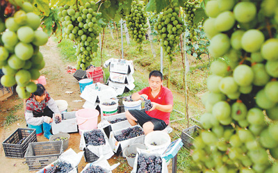 南康市三江鄉(xiāng)明輝葡萄基地主人陳春明(右)在收獲葡萄。宗家財(cái) 楊曉明攝