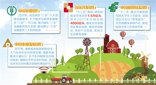 在我國銀行業推動金融精準扶貧的過程中,各大銀行各顯身手。國開行2016年共發放精準扶貧貸款3153億元;“十三五”期間,國開行將發放脫貧攻堅貸款1.5萬億元,其中2017年計劃發放4000億元,精準支持貧困地區基礎設施、易地扶貧搬遷、特色產業發展、教育衛生改善等領域。郵儲銀行則在今年初明確了下一步金融精準扶貧的六項工作,包括通過開展幫助貧困大學生上學就業、貧困地區分支行“幫帶提升”、無償捐贈等多種方式,推進脫貧攻堅工作有效開展。