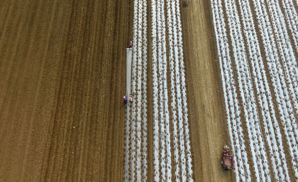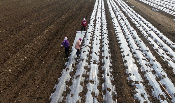 2月19日,在山東省郯城縣民樂種植農民專業合作社種植基地,工人為種植的土豆覆膜。