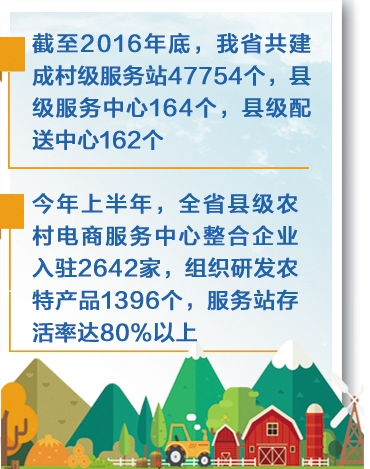 政策給力,讓我省農村電商網絡快速織密。截至2016年底,我省共建成村級服務站47754個,縣級服務中心164個,縣級配送中心162個,實現了縣域農村電子商務公共服務體系全覆蓋、農村電子商務雙向流通渠道全覆蓋、農村電子商務應用普及全覆蓋。