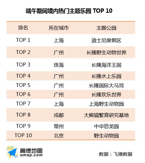 因端午假期正值父親節,加之暑期來臨,主題樂園也成為家庭游玩的熱門場所。根據飛豬大數據統計,端午期間最受歡迎的主題樂園前三名分別為:上海迪士尼度假區,廣州長隆野生動物世界,珠海長隆海洋王國。