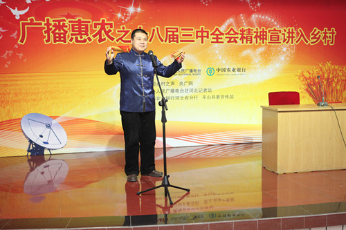 今天由中央人民廣播電臺和中國農業銀行聯合舉辦的廣播惠農之“十八屆三中全會精神宣講入鄉村”系列活動在河北省石家莊市平山縣平山鎮成功舉行。活動中,青年曲藝演員馬星野,把十八屆三中全會精神編成了快板,鄉親們非常喜歡。
