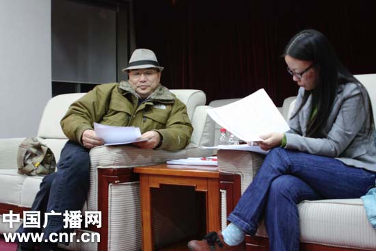 解放軍空軍政治部文工團的副團長張?zhí)煊钆c主持人蔣術(shù)進行直播前的溝通