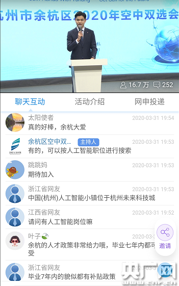 “在這萬物生長、欣欣向榮的季節里,疫情無法阻擋春天的腳步,也無法阻擋我們求賢若渴的決心。在這里,我向大家發出最誠摯的邀請:這個春天,讓我們一起相約在余杭!”直播中,區委組織部(人才辦)相關負責人向人才們伸出“橄欖枝”。來自阿里巴巴、之江實驗室、貝達藥業、西奧電梯、諾爾康等企業人才代表為余杭“代言”推介。