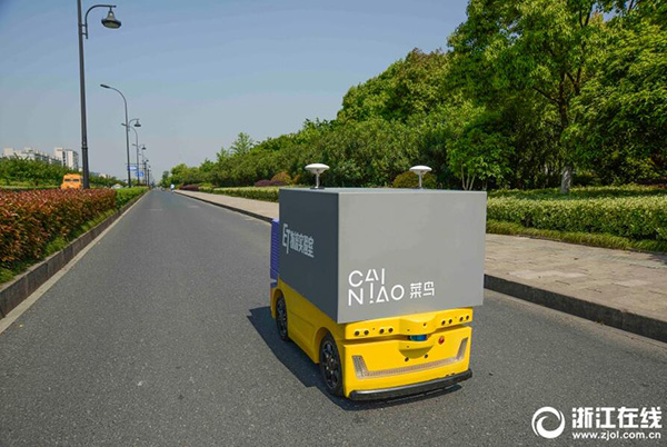 2018年4月18日,在杭州市文一西路上,一輛半人高的四方小車,在無人駕駛的情況下,一路停停走走,行駛在送快遞的路上。據(jù)了解,這是菜鳥旗下ET物流實驗室研發(fā)的無人車,正在進行路測。當日,在10公里的路測路段,無人車已經(jīng)能夠完成內(nèi)部的文件等收發(fā)配送。菜鳥無人車定位在末端配送,車速最高控制在15km/小時,車輛制動距離可以控制在0.5——0.3米。菜鳥無人車量產(chǎn)商用在即,年內(nèi)將全面進入末端進行配送。(記者 楊曉軒 攝)