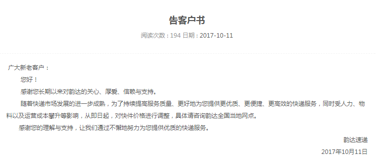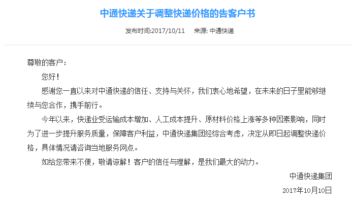 10日,中通方面表示,今年以來,快遞業(yè)受運輸成本增加、人工成本提升、原材料價格上漲等多種因素影響,同時為了進一步提升服務(wù)質(zhì)量,保障客戶利益,中通快遞集團經(jīng)綜合考慮,決定從即日起調(diào)整快遞價格;11日,韻達快遞表示,為了持續(xù)提高服務(wù)質(zhì)量、更好地提供更優(yōu)質(zhì)、更便捷、更高效的快遞服務(wù),同時受人力、物料以及運營成本攀升等影響,從即日起,對快遞價格進行調(diào)整。