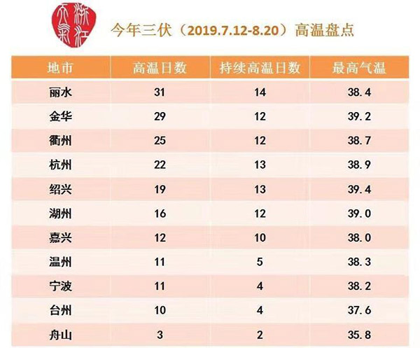 今年夏天,浙江的最高氣溫出現(xiàn)在哪?浙江省氣象服務(wù)中心發(fā)布了今年三伏天的高溫盤點,三伏天里,高溫日數(shù)和持續(xù)高溫日數(shù)最多的市均為麗水,分別為31天和14天,而最高氣溫則出現(xiàn)在紹興,為39.4℃。