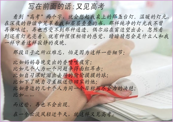 又是一個6月天,高考的號角再一次吹響。空氣里不免有著一種讓人窒息的壓抑。而在零零碎碎的片段中拾掇起有關(guān)高考的點點滴滴,當(dāng)初恐懼和不安的眼神,匆忙而模糊的身影,擁擠的課桌,堆疊如山的試卷和書本以及單調(diào)乏味的生活,卻都成了如今我們經(jīng)常咀嚼、不忍忘卻的回憶。我想說 |