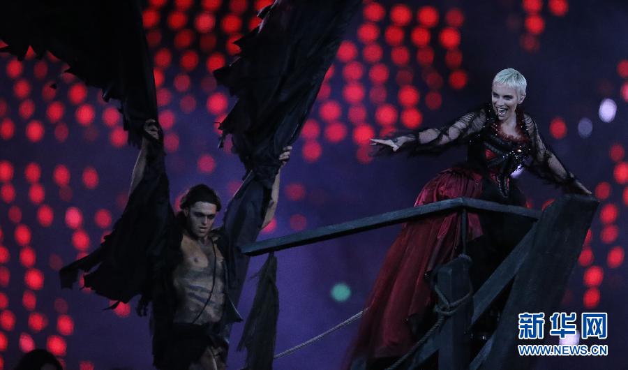2012年8月12日 ,第三十屆夏季奧林匹克運動會閉幕式在倫敦奧運會主體育場舉行。圖為安妮·倫諾克斯(右)在閉幕式上演唱。 新華社記者 沈伯韓 攝