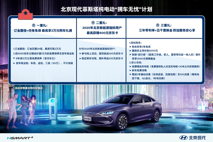 針對獲得2020年北京新能源指標(biāo)的準(zhǔn)車主,只要參與北京現(xiàn)代線上活動,留資并通過驗(yàn)證即可直接獲得200元京東卡;注冊會員并到店賞車試駕,還可額外獲得200元的京東卡,累計(jì)價(jià)值400元。此外,消費(fèi)者還可享受3年免息政策,而對于置換用戶來說,還可在此基礎(chǔ)上獲得5000元置換補(bǔ)貼。特別值得一提的是,為致敬抗擊一線的“逆行者”,包括醫(yī)務(wù)工作者、軍人、警察等還可額外享受3000元保障基金。