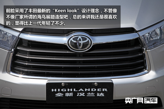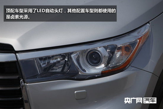 很多人管漢蘭達叫大漢,但這個大漢卻又不是粗糙的摳腳大漢,絕對是經過精心設計的。前臉采用了豐田最新的“Keen look”設計理念,不管像不像廠家所謂的海鳥展翅造型吧,總的來講我還是很喜歡的,顯得比上一代年輕了不少。頂配車型采用了LED自動頭燈,其他配置車型則都使用的是鹵素光源。