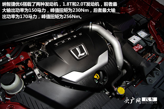 納智捷優6搭載了兩種發動機,1.8T和2.0T發動機,前者最大輸出功率為150馬力,峰值扭矩為230Nm,后者最大輸出功率為170馬力,峰值扭矩為256Nm。與之匹配的是來自愛信的6AT變速箱。