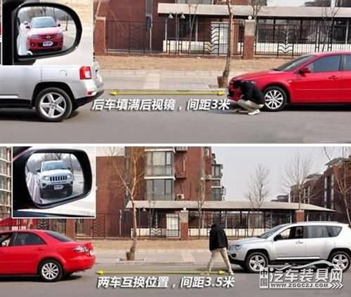 SUV在前,小車在后:當后車充滿后視鏡時,進行測量后發現前后車差距為3米左右。