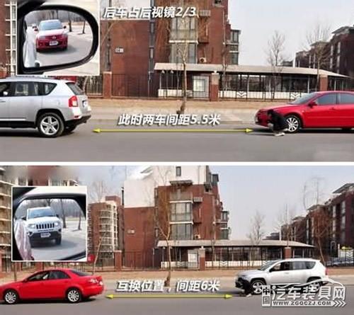 SUV在前,小車在后:當后車充滿后視鏡的2/3時,進行測量后發現前后車差距為5.5米左右。
