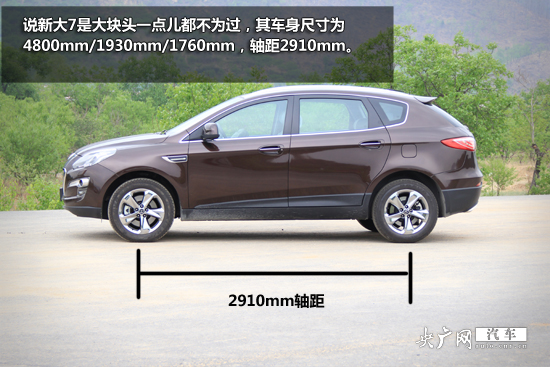 說新大7是大塊頭一點(diǎn)兒都不為過,其車身尺寸為4800mm/1930mm/1760mm,軸距2910mm。數(shù)據(jù)上除高度以外都超過了沃爾沃XC90,逼近奔馳ML級(jí)中大型SUV。而其整備質(zhì)量也達(dá)到 1960千克。