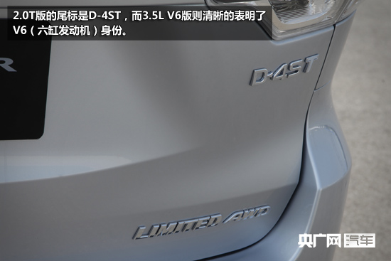 車輪輪轂根據配置高低有18寸和19寸兩個尺寸,共有三種輪轂造型可供選擇,輪胎則采用了韓泰、鄧祿普和東洋三個品牌,其中我們的2.0T四驅頂配試駕車配備的是東洋輪胎。如果想辨識全新漢蘭達是2.0T版還是3.5L V6版,最容易的辦法就是看尾標,2.0T版的尾標是D-4ST,而3.5L V6版則清晰的表明了V6(六缸發動機)身份。