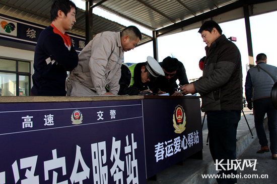 在春運交通安全服務站,民警正在登記檢查。長城網 高琳哲 攝
