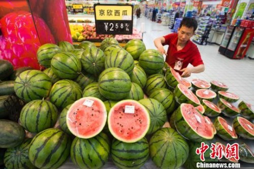 資料圖:山西太原,超市員工正在整理西瓜。 張?jiān)?攝