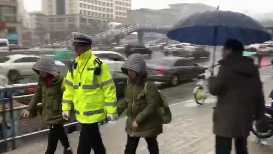 1月9日清晨7點左右,當許多人在還暖室迎接2019年的第一場雪,一條暖心的微視頻在微博和朋友圈迅速轉發、傳播。畫面中雪天風寒,一位執勤交警將兩位小學生送過積雪成冰的緩坡,正打算轉身離去投入交通早高峰的疏導時,孩子們自發地向這位“暖心”交警敬禮。
