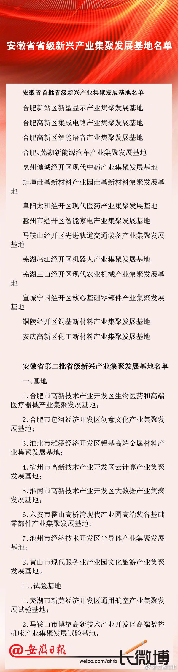安徽全力推進(jìn)省級戰(zhàn)略性新興產(chǎn)業(yè)集聚發(fā)展基地建設(shè)。2015年,安徽省政府確定了第一批省級戰(zhàn)略性新興產(chǎn)業(yè)集聚發(fā)展基地,合肥新站區(qū)新型顯示產(chǎn)業(yè)集聚發(fā)展基地等14家入圍。2016年,省政府確定第二批10家戰(zhàn)略性新興產(chǎn)業(yè)集聚發(fā)展基地,其中基地有8家,試驗(yàn)基地有2家。目前,安徽省戰(zhàn)略性新興產(chǎn)業(yè)集聚發(fā)展基地共有24家。