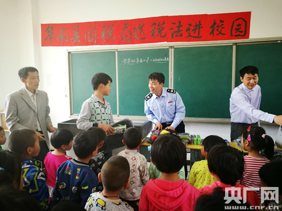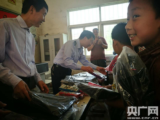 阜南縣國稅局局長陳東康和愛心企業給孩子們發送文具