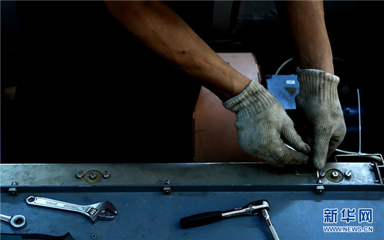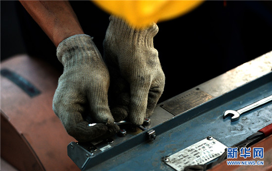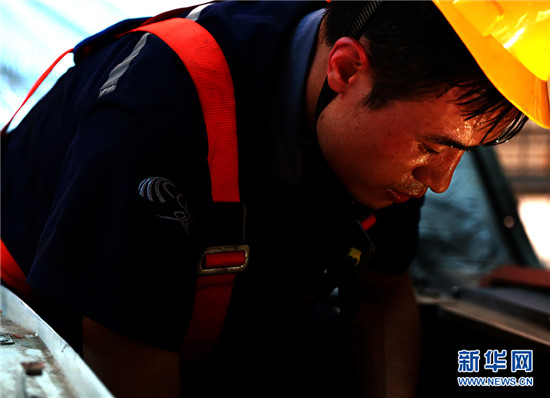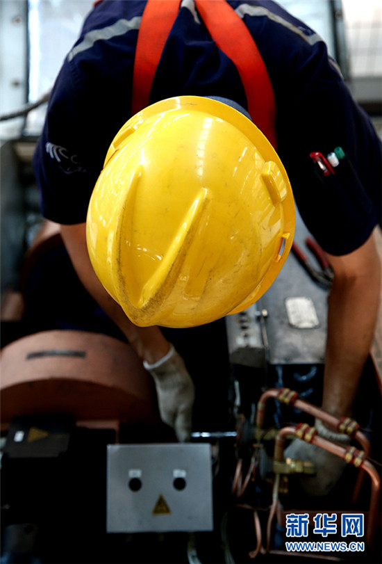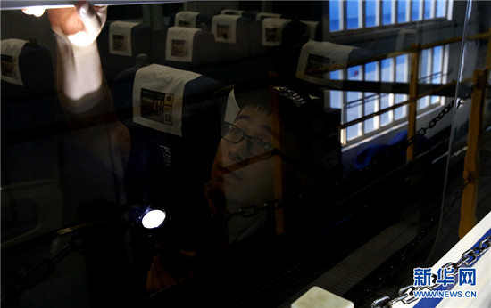 在高達50℃的動車檢修廠內(nèi),動車組機械師李洲正在對CRH380B型動車組空調(diào)系統(tǒng)進行故障處理。新華網(wǎng) 陳揚 攝