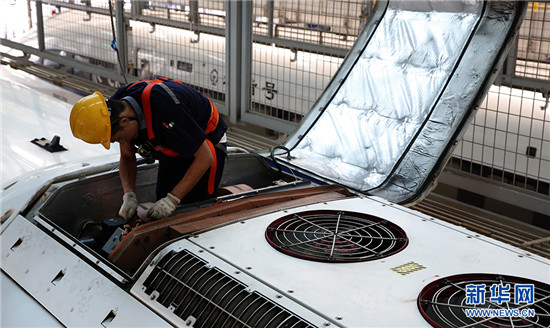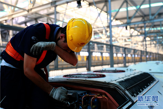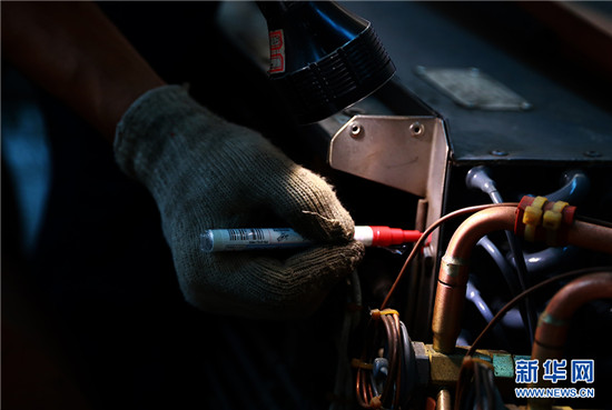 在高達50℃的動車檢修廠內(nèi),動車組機械師李洲正在對CRH380B型動車組空調(diào)系統(tǒng)進行故障處理。新華網(wǎng) 石璐 攝