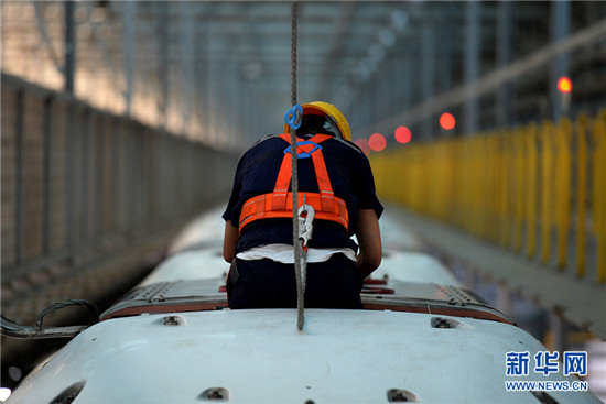 在高達50℃的動車檢修廠內(nèi),工作人員正在為動車“體檢”。新華網(wǎng) 陳揚 攝