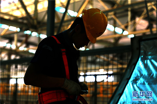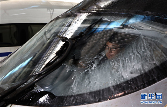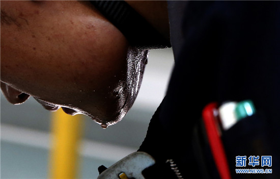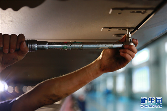 在高達50℃的動車檢修廠內(nèi),工作人員正在為動車“體檢”。新華網(wǎng) 石璐 攝
