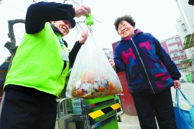 勁松五區分布著26棟居民樓,1200戶居民,社區齊整清凈。上午9點多,63歲的國紅秀趕到小屋門口,熟練地把分好類的垃圾遞給工作人員。稱重、刷卡、積分,短短1分鐘,一袋果皮菜葉和幾個紙盒就為她掙了4分。“垃圾分類是習慣成自然,一點兒都不難。”國阿姨說,社區給每戶家庭都發放了垃圾分類指導手冊,通俗易懂,一學就會,“比如說這廚余垃圾吧,簡單說就是會‘爛’的垃圾,像果皮、骨頭、菜葉、蛋殼之類。”現在,她的積分卡里已經有80分了,能換洗手液、衛生紙等生活用品,也可以享受家政保潔、理發等社區服務。
