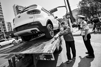 除了高速公路,亞運村交通大隊還在人流車輛密集的望京SOHO周邊設點執法。該區域由于寫字樓密集,配建停車位缺口大,許多人把車輛隨意停放在沒有劃設停車位的路邊,嚴重影響正常交通出行。一位協管員直言,每天貼條都貼不走違法停車。交警在執法中發現,一輛白色起亞牌汽車任性地停放在十字路口導流帶內,為了逃避處罰,司機不僅摘了車牌,還用紙條把擋風玻璃下的車架號擋上了。無獨有偶,附近一輛違停的長安牌小汽車也用了同樣的伎倆。隨后,交管部門依法對這兩輛車進行了清拖。