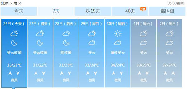 未來(lái)一周大部分時(shí)間北京都會(huì)以晴到多云天氣為主,天氣炎熱,最高溫可達(dá)33-34℃,最低溫在21-24℃之間,但今天至28日午后到傍晚西部、北部多分散性雷陣雨天氣,提醒大家注意防范。