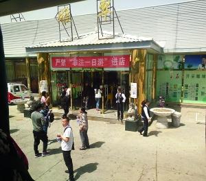 導游帶著游客們進店購物,店門口掛著嚴禁“非法一日游”進店