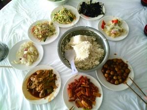 雖然是8個菜,但所謂的“葷菜”只是豆皮、鍋巴之類的假葷菜,素菜是海菜、白菜等咸菜,米飯是色澤發(fā)黃的陳舊大米