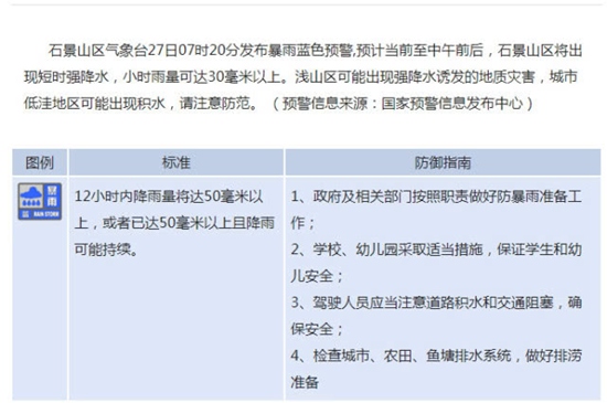 人民網北京7月27日電 石景山區氣象臺27日07時20分發布暴雨藍色預警,預計當前至中午前后,石景山區將出現短時強降水,小時雨量可達30毫米以上。淺山區可能出現強降水誘發的地質災害,城市低洼地區可能出現積水,請注意防范。(預警信息來源:國家預警信息發布中心)