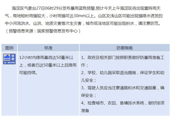 海淀區氣象臺27日06時29分發布暴雨藍色預警,預計今天上午海淀區將出現雷陣雨天氣,局地短時雨強較大,小時雨強可達30mm以上。山區及淺山區可能出現強降水誘發的中小河流洪水、山洪、地質災害等次生災害,城市低洼地區可能出現積水,請注意防范。(預警信息來源:國家預警信息發布中心)