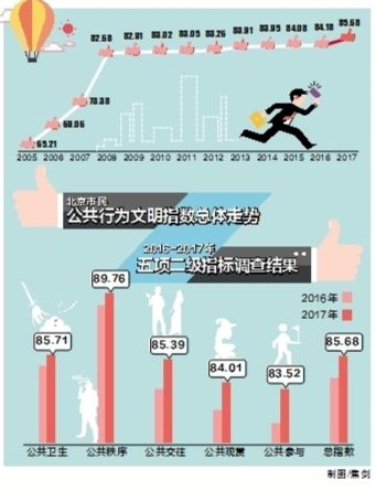 2017年北京市民公共行為文明指數發布:首次突破85,達85.68,比2016年提升了1.5個分值;與2005年相比,這個數字上升了20.47。調查顯示,公共交往、公共觀賞、公共參與指數大幅上升,而“隨地吐痰”“闖紅燈”“不進行垃圾分類”依然是受訪者眼中最不文明的行為。