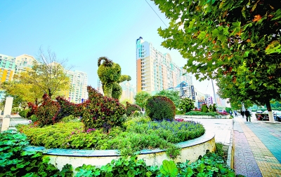 沿鎮國寺北街走一圈兒,會有“久在樊籠里、復得返自然”的感覺。道路中間景觀帶中,孔雀草、小菊、美蘭菊、醉蝶花等鮮花盤繞,一路綿延。每隔五百米,就有三角梅、小麗花、孔雀草、一品紅等各種花卉組成的花缽映入眼簾,在草橋幼兒園門口、地鐵旁、道路交叉路口等,布置著卡通人物、天鵝等主題花壇。在路邊的人行步道旁,還有一條200米的景觀示范段,休閑設施、座椅廊架等穿插在五組花境中,置身其中頗有穿越之感。