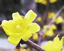 現場:沿著蕙芳園蜿蜒的竹林小徑,穿過一座樸實無華的柴門,地形突然起伏,青松樹下幾枝金黃閃現眼前,20余株馨香素雅的蠟梅正在盛開。