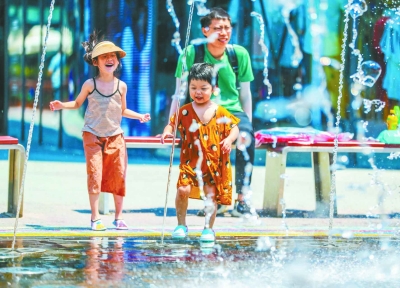 北京連日晴熱高溫,在五棵松華熙,孩子們在一處噴泉邊戲水納涼。本報記者 武亦彬攝