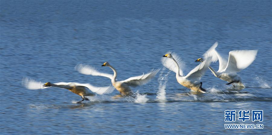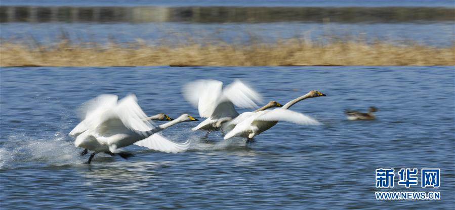 這是北京市密云區太師屯鎮蘆各莊村清水河水面上的野生白天鵝(3月13日攝)。 記者3月22日從北京市密云區委宣傳部獲悉,得益于密云水庫周邊生態環境改善,闊別12年之后,密云區太師屯鎮蘆各莊村清水河再次迎來大量野生白天鵝棲息。(新華社齊如久 攝)