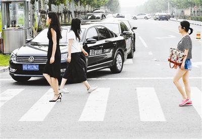 7月5日,貼著“禮讓斑馬線”的滴滴快車從后廠村路附近的馬路經(jīng)過。在即將到達(dá)斑馬線時(shí),幾位司機(jī)都穩(wěn)穩(wěn)踩住了剎車,路過的行人側(cè)頭露出笑容。