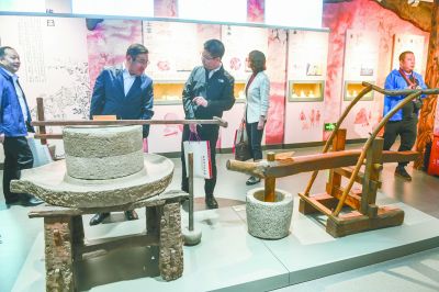 8日上午,在首都糧食博物館,觀眾近距離了解舊時糧食加工工具。