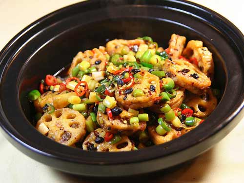 (2)熱油鍋將肉炒至7成熟,盛起;另起油鍋爆香蔥、泡椒,放入藕片,以大火快炒至7成熟,肉片回鍋炒熟,再加醋、鹽調(diào)味即可。