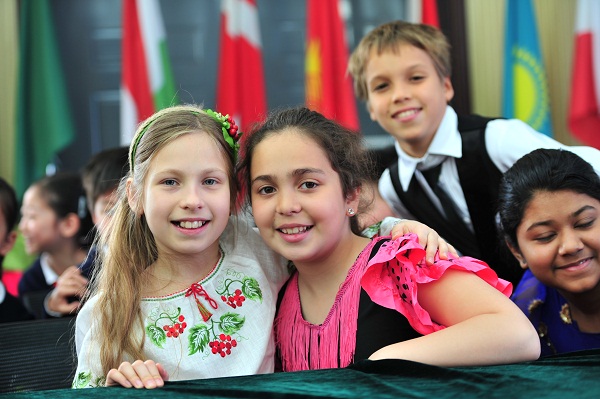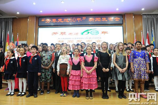 習近平總書記在2013年六一節到來之際,曾到北京少年宮看望同學們,并與在那里參加活動的芳草地的同學合影,儀式上芳草地中國部的“融之聲”合唱團唱起了《習爺爺是咱們的大朋友》,再次憶起那幸福的時光。芳草地國際部不同國籍的5名學生表演了詩朗誦《和平的色彩》,贏得一陣陣熱烈的掌聲。