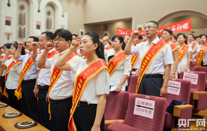 央廣網北京7月13日消息(記者孫瑩)據中國之聲《央廣新聞》報道,2017年度“1+1”中國法律援助志愿者行動啟動儀式在北京人民大會堂舉行,242名律師和大學生志愿者從司法部部長、黨組書記張軍手中接過了“1+1”中國法律援助志愿者行動旗幟,并莊嚴宣誓,他們將奔赴青海、西藏、新疆、貴州等14個省(區、市)和新疆生產建設兵團的170多個縣(區),開展為期一年的法律援助志愿服務,扶貧攻堅。